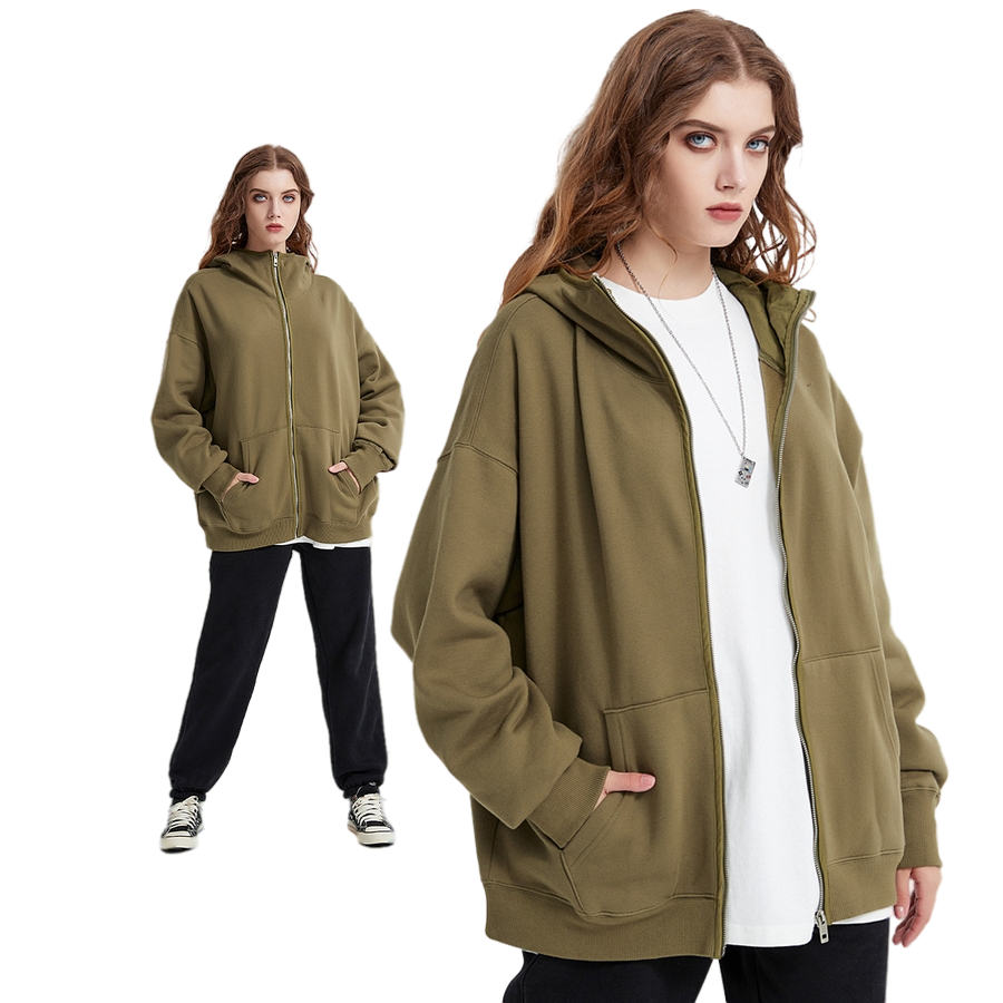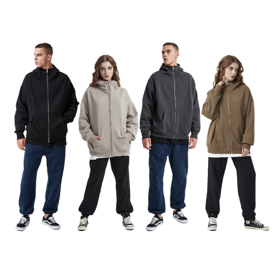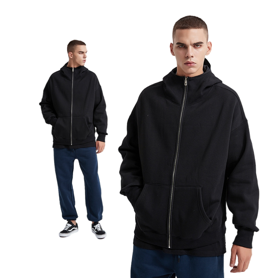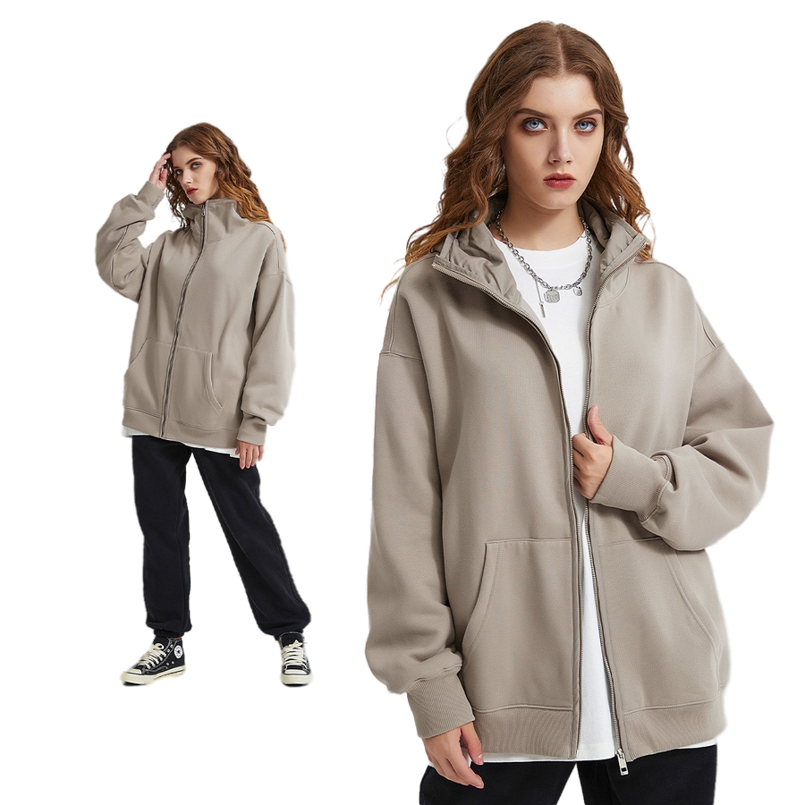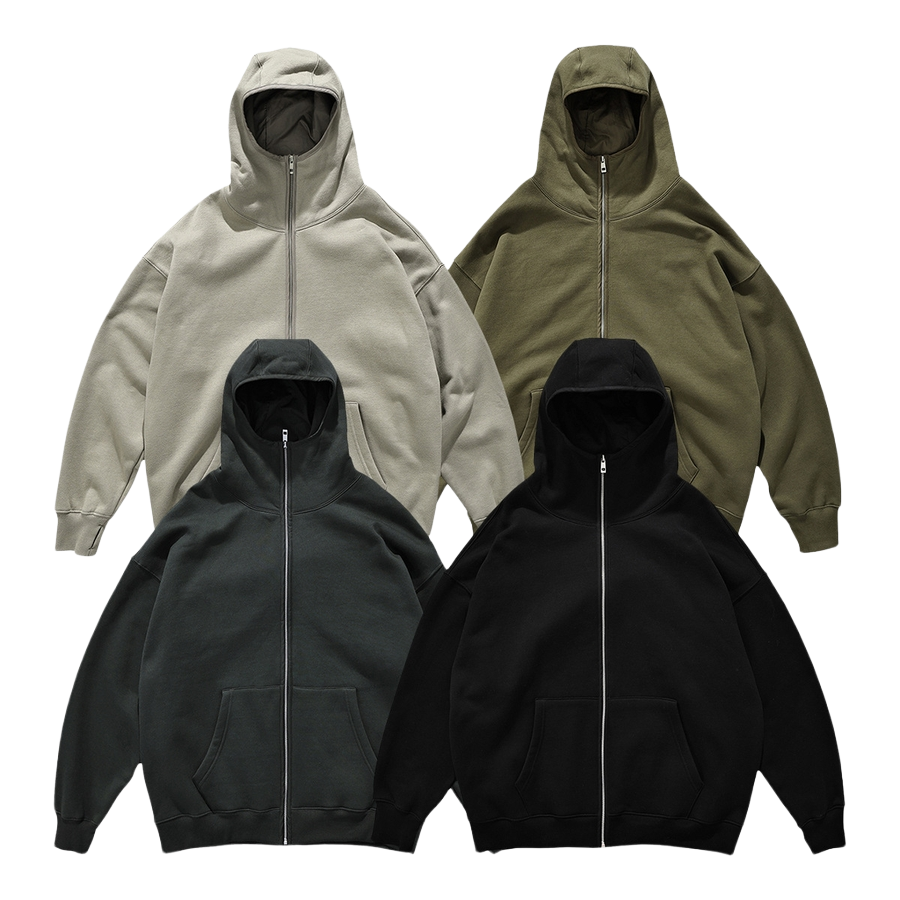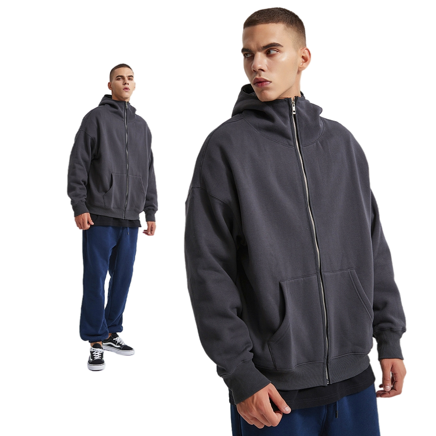 Crafted from 100% premium cotton with a 350g GSM weight, this zip-up hoodie redefines casual comfort. Its structured, oversized silhouette is elevated by a high-neck collar, offering superior warmth and a distinctly modern, urban look. Available in essential muted tones (Black, Dark Grey, Light Taupe, Olive), it's the perfect outer layer for any season.