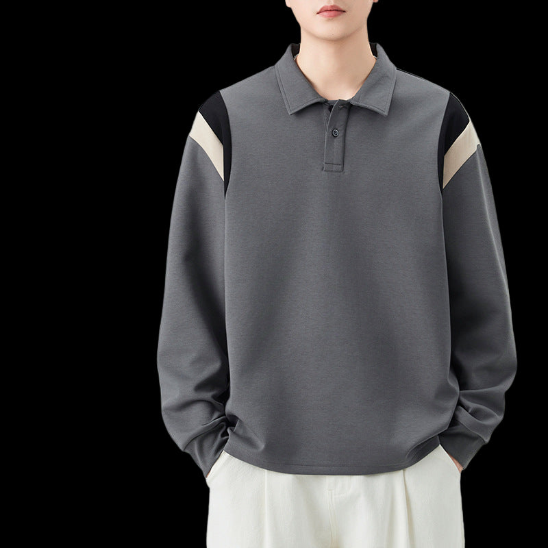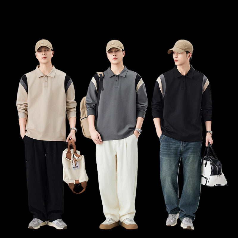 A sophisticated blend of sporty structure and casual comfort. This long-sleeve polo features a clean collar and a blend of 50.7% Cotton, 42.4% Polyester, and 6.9% Elastane, providing a soft, stretchy, and substantial feel. The standout element is the modern contrast-color shoulder paneling over the raglan sleeves, adding a dynamic, athletic-inspired touch to its polished look.