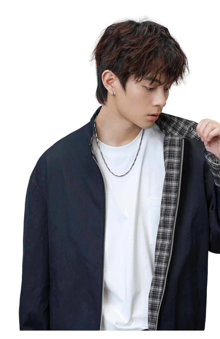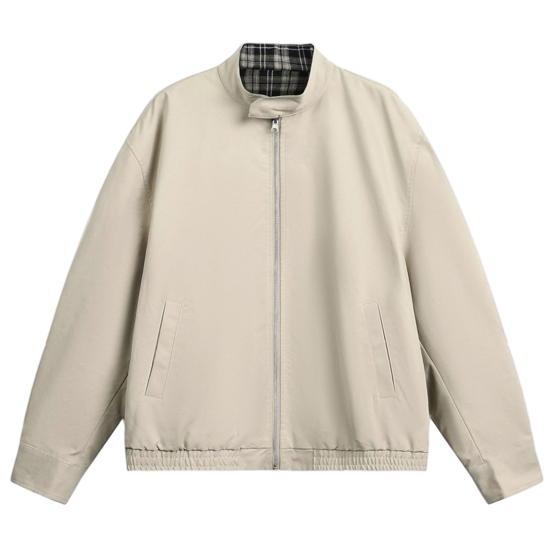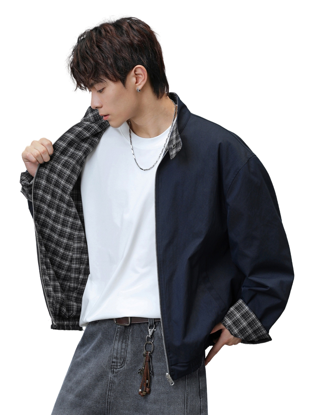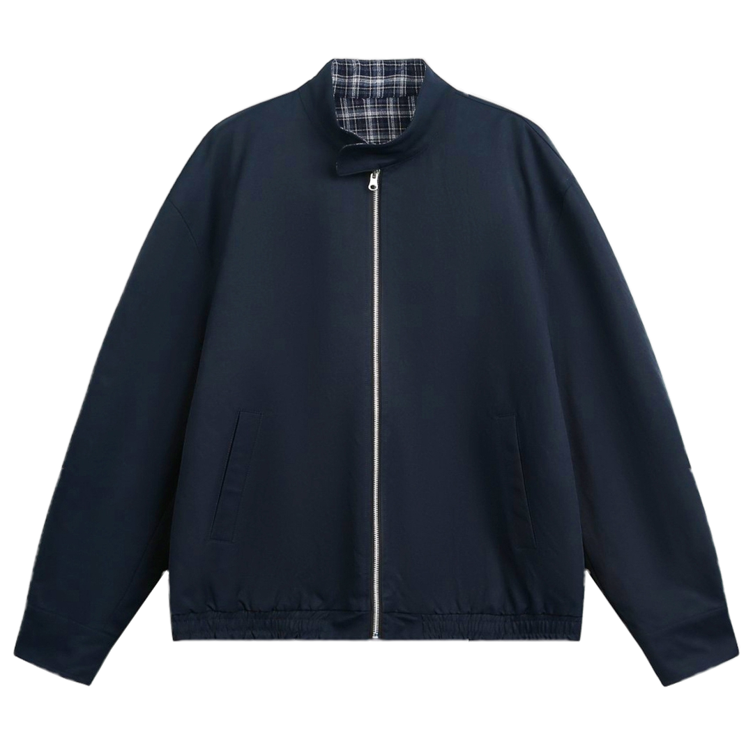 This versatile jacket is the ultimate layering piece for the unpredictable mid-season weather. Crafted entirely from 100% durable polyester fiber, it serves as a lightweight yet highly effective windbreaker. The true strength of this piece lies in its full reversibility, instantly transforming your look from a clean, solid exterior (Navy or Beige) to a subtle, patterned check lining.